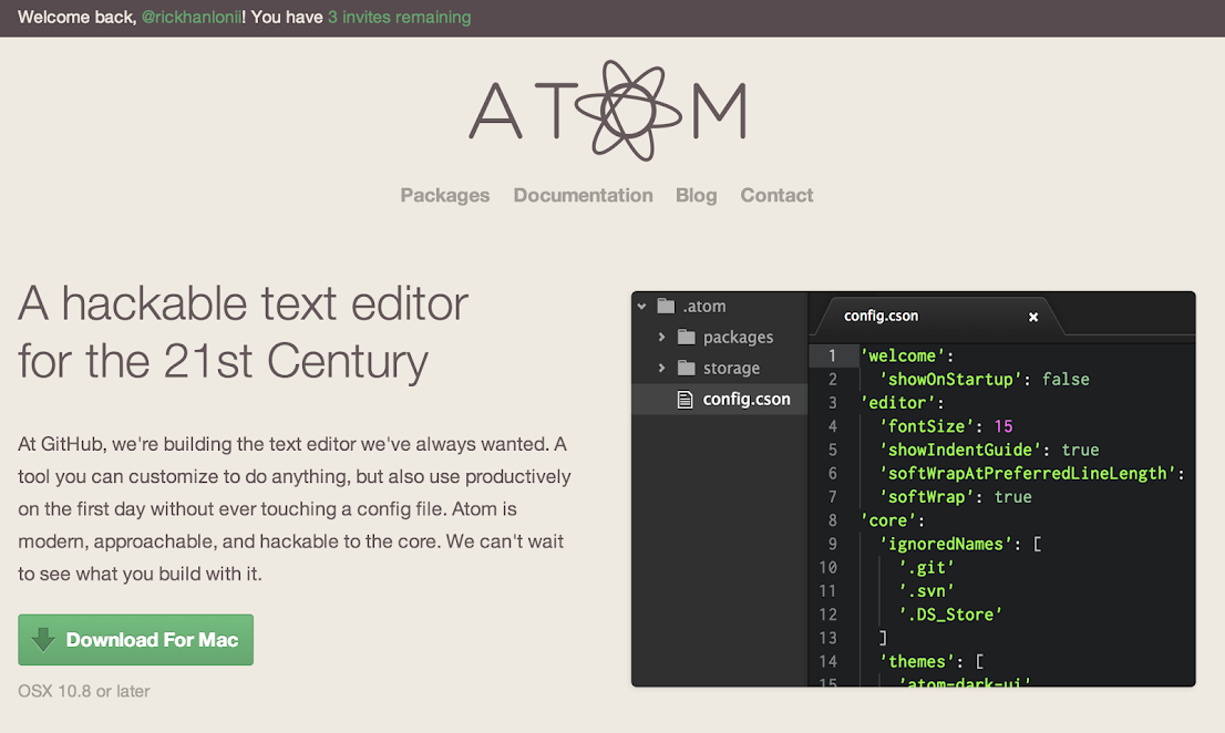 Atom es un editor de código de fuente abierta para macOS, Linux, y Windows con soporte para plug-ins escrito en Node.js, Incrustando Git Control, desarrollado por GitHub. Atom es una aplicación de escritorio construida utilizando tecnologías web.